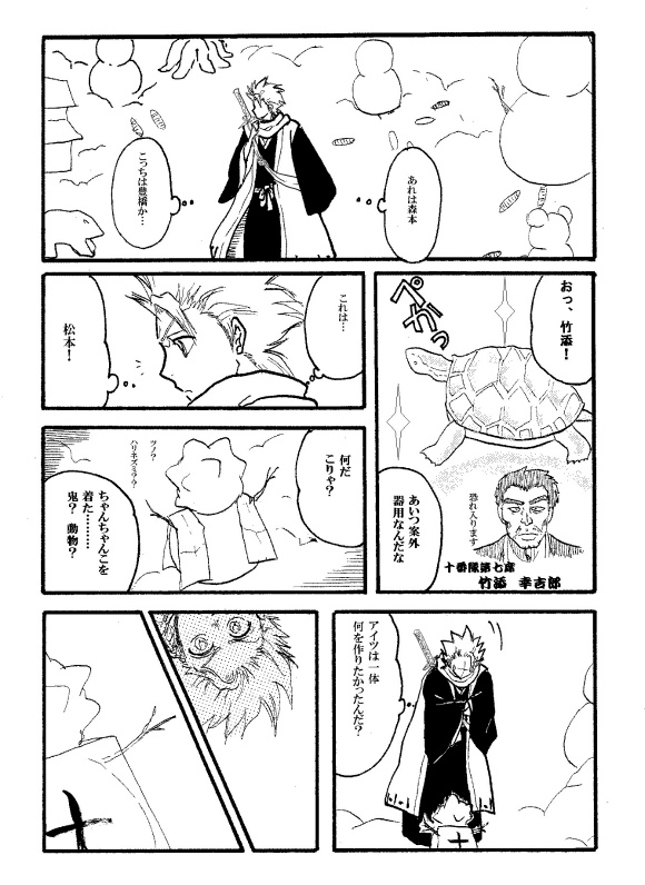雪だるまに残る霊圧はとても優しかった。不格好なのは技量が及ばなかっただけだ。彼女が親愛の気持ちをもって隊首の像に挑戦したことが、その霊圧だけで伝わってくる。しばらくの間、彼は奇妙な雪だるまを眺めていた。